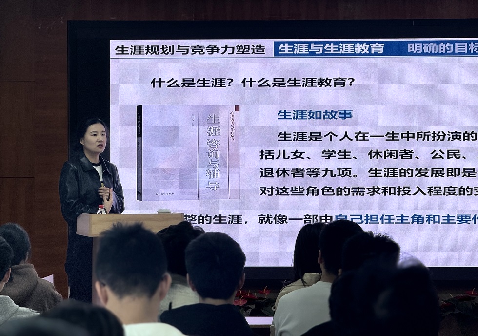 讲座伊始,常娜系统阐释生涯规划的核心内涵,强调生涯是个人一生扮演多重角色的综合与动态发展过程。同时,深入剖析05后大学生生涯发展呈现的更动态、更自我、更灵活、更务实趋势,指出该群体的行动核心动力更倾向于“兴趣驱动”与“价值认同”。另外,常娜结合当前就业挑战以及人工智能技术催生新职业等宏观背景,深刻分析严峻的就业形势与AI时代的独特挑战与机遇,阐明生涯规划的深远意义。