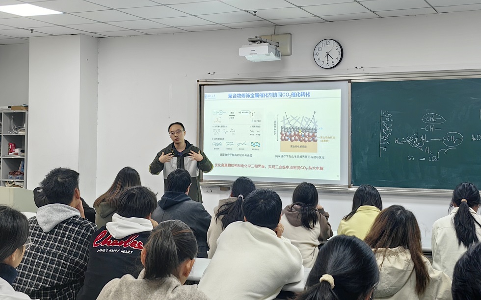 魏鹏飞向同学们介绍了碳中和背景下产业发展现状及机遇挑战,强调当前背景下加速化工绿色转型的必要性,他重点展示了二氧化碳电催化转化技术的前沿研究,对电催化小分子转化的应用前景与技术瓶颈进行分析,并展示了该领域的最新研究成果。讲座期间,他以催化基础和器件技术为例,结合大学课程内容,直观地帮助同学们将理论课程学习和实际应用联系起来。
